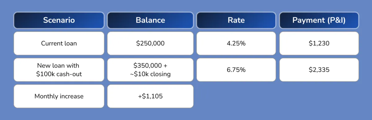 Assume a $400,000 home, $250,000 current balance at 4.25%, and a new 30-year rate of 6.75%.